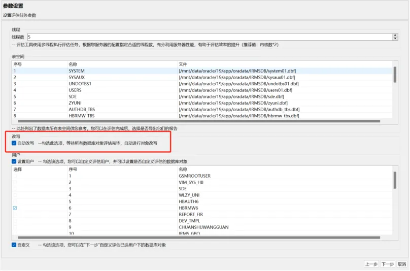 任务创建或者任务编辑流程中的参数设置页面,具有自动改写配置项。勾选此选项,在评估任务结束后,会对检测到的可改写对象进行自动化改写。
