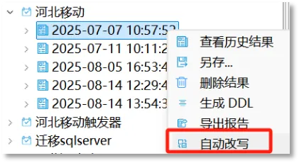 在生成的评估结果上右键单击,将出现“自动改写”选项。选择该功能后,工具会对评估结果中包含的所有对象结构语句进行统一批量改写。若此评估结果当前已在工具中打开,则相关改写指标数据和对象属性将实时更新。