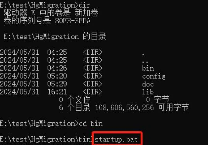 在 windows 平台下,可以在 cmd 或者 powershell 中进入迁移工具解压后的安装,目录的 bin 目录中,然后执行 startup.bat 脚本,以 CMD 环境为例: