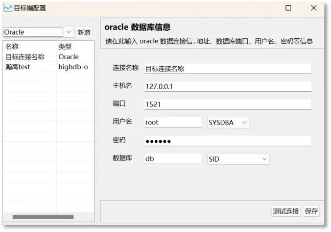 SQL目标端执行分为目标端配置与对象DDL执行两个部分。目标端配置是指提供图形化界面,用于配置指向目标数据库的连接。目前支持oracle、sqlserver、mysql以及higodb四种数据库系统。