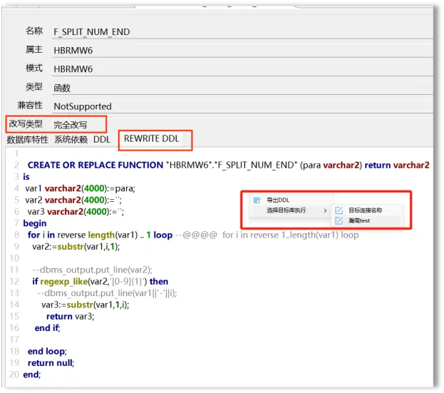 对象DDL执行是指在对象详情页面的DDL文本上点击右键,通过选择配置好的目标端数据库连接执行,返回执行结果。